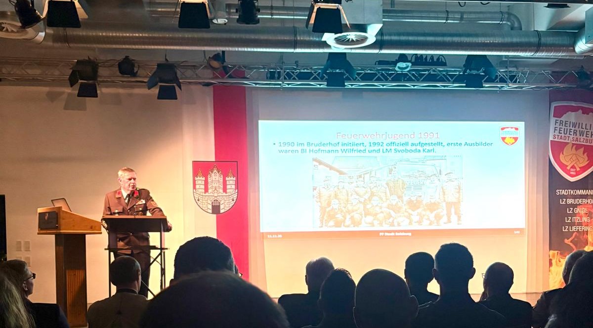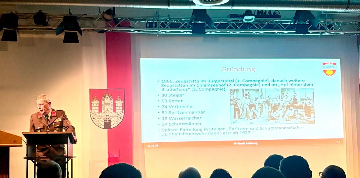 Nach den Ansprachen mit Danksagungen und Glückwünschen präsentierte das ” Brain of Histroy “, langjähriger Kommandant des LZ Bruderhof, OBI Vidmer Harald einen profunden Abriss der Geschichte des Feuerwehrwesens in der Stadt Salzburg im speziellen natürlich über die Entwicklung der Freiwilligen Feuerwehr der Stadt Salzburg.