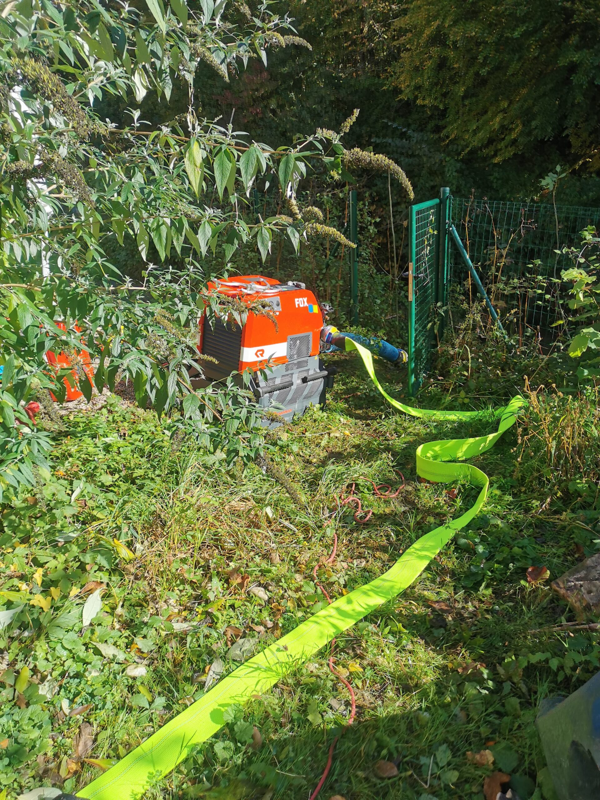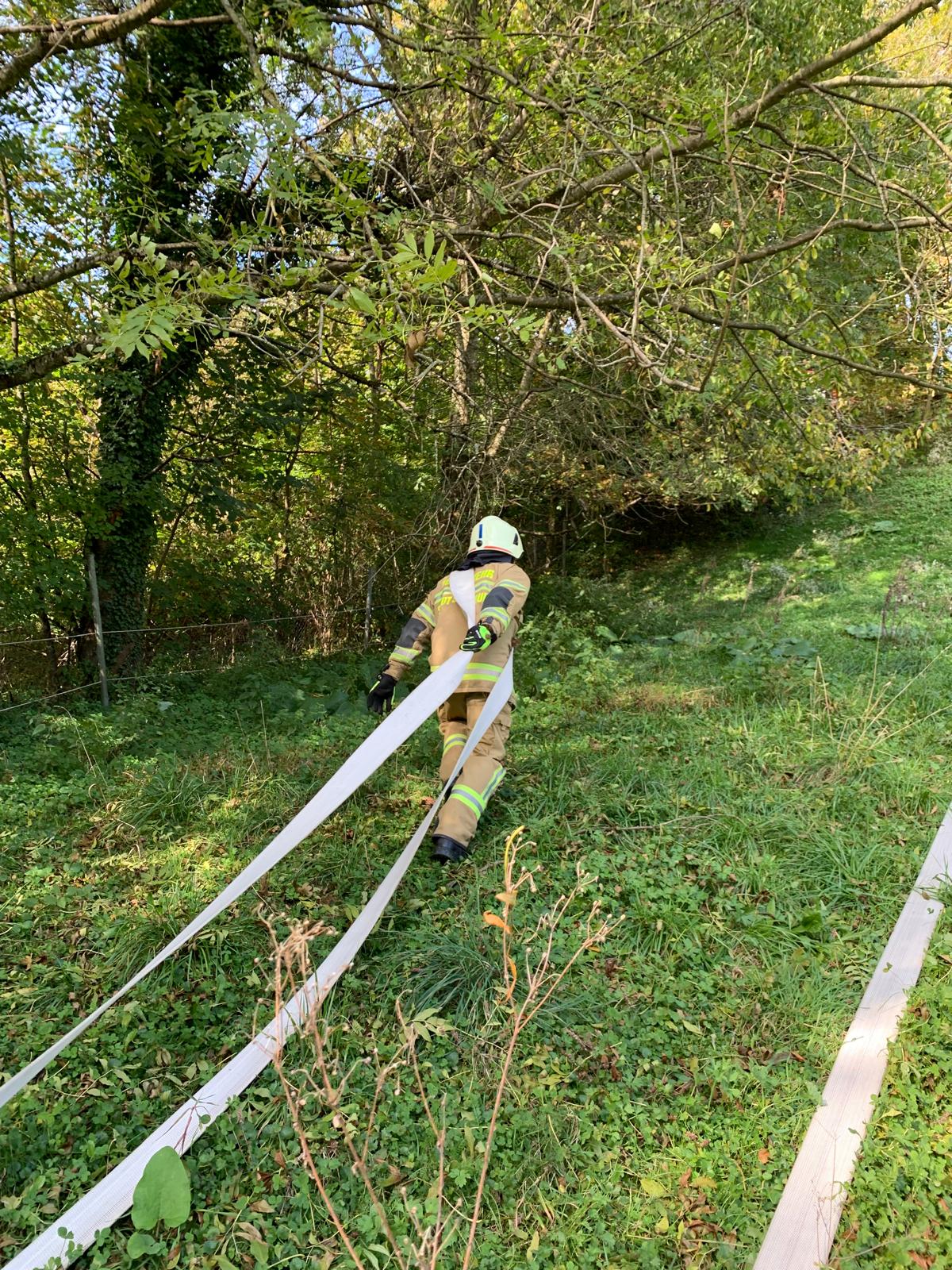 Aufgabe für die Besatzung der Pumpe 1 Bruderhof war es an der Glockmühlstraße am Alterbach eine Saugstelle mit einer Fox 4 einzurichten und über 200 Meter und 40 Höhenmeter das benötigte Löschwasser zur Pumpe der FF Ebenau zu transportieren.