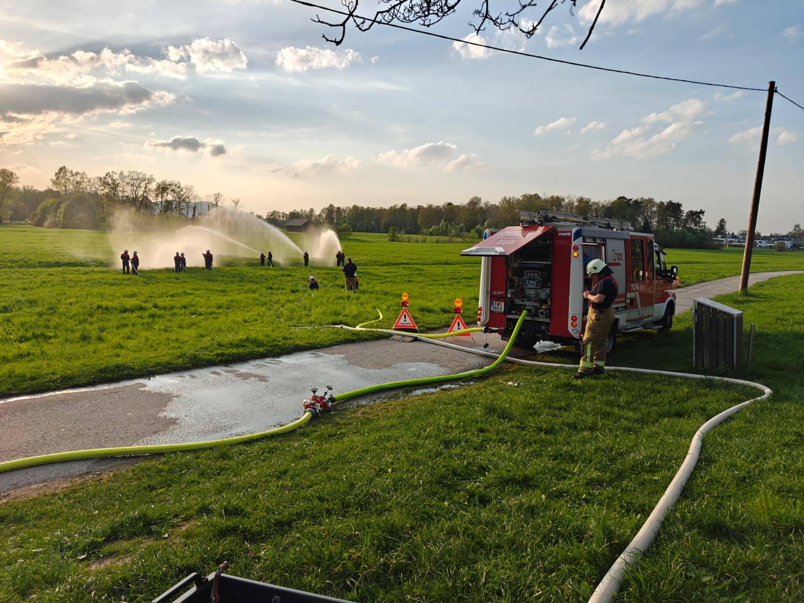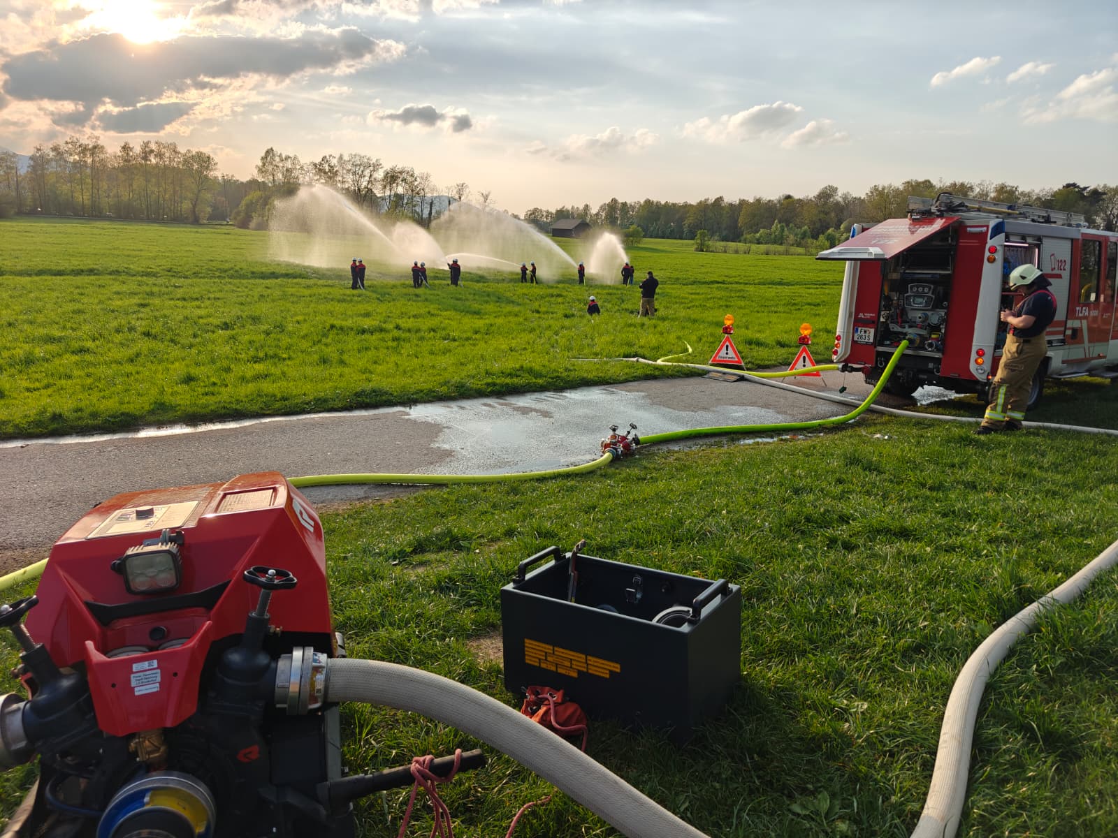 Damit noch nicht genug, wurde vom Tank 2 eine weitere B Leitungen vorgenommen und dann an dem in Stellung gebrachten Verteiler weitere 3 C Rohre für einen fiktiven Löschangriff vorgenommen.