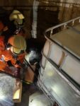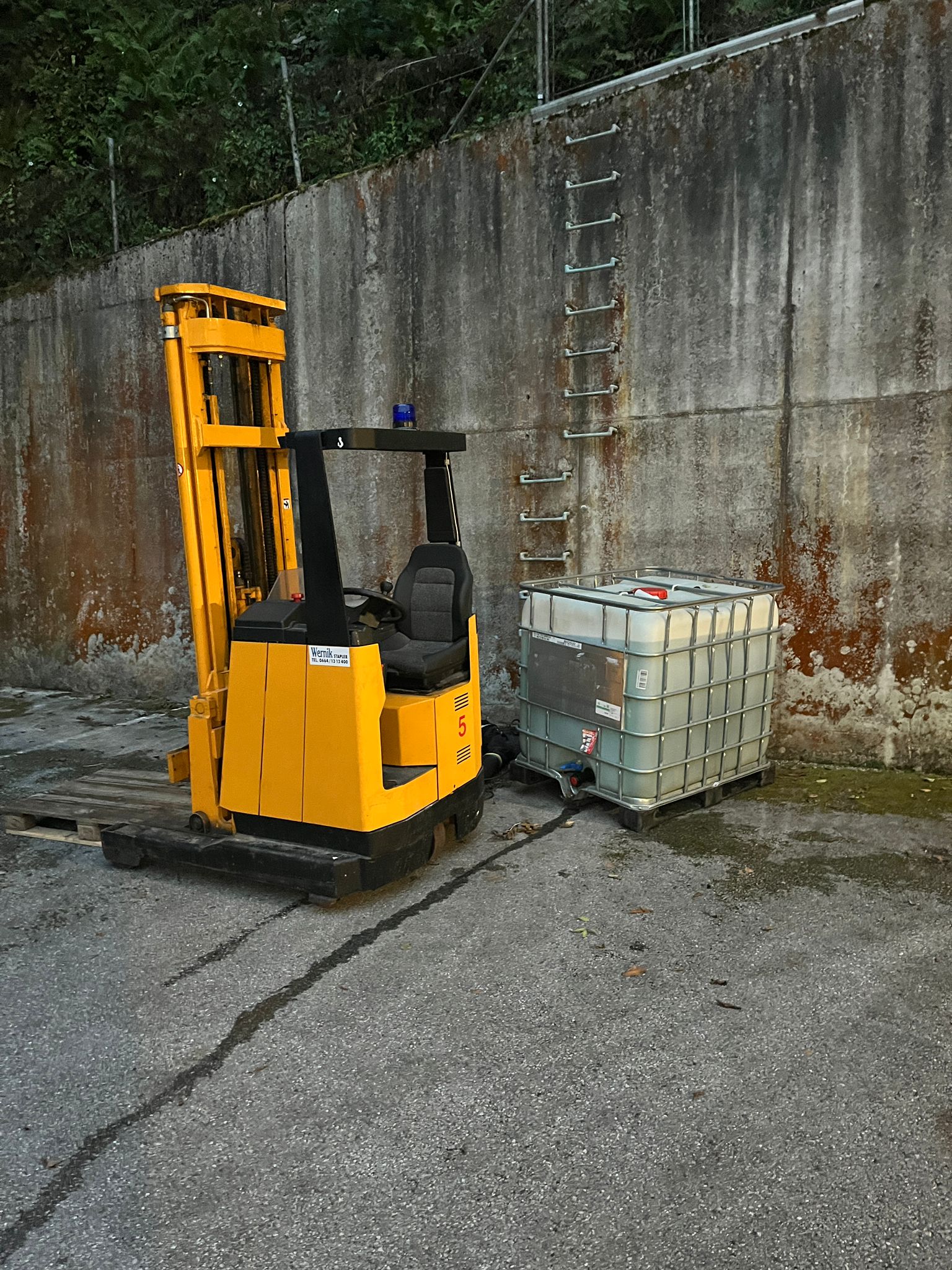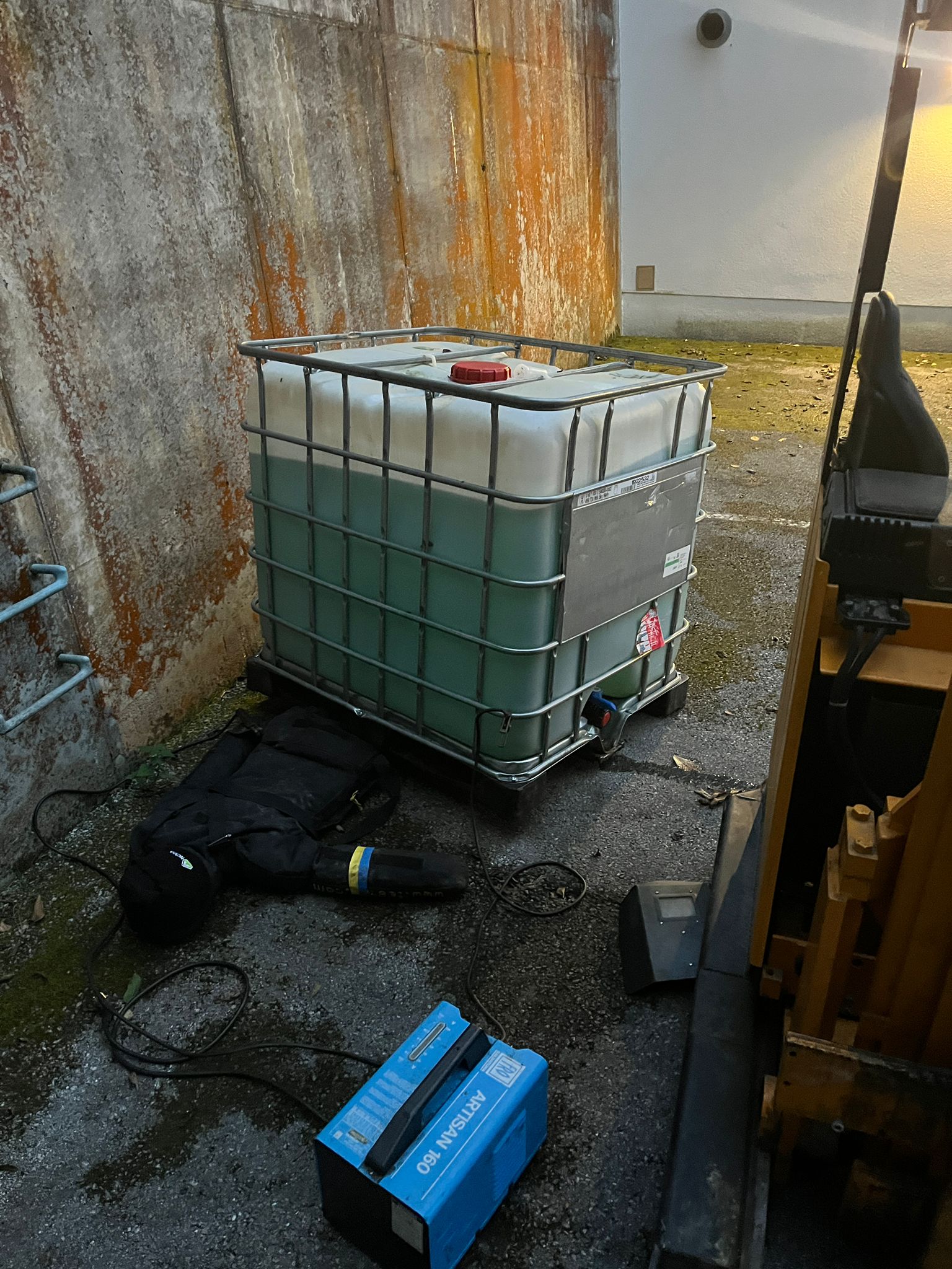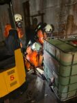 Ein defekter und noch befüllter IPC Behälter war durch einen gebrochen Rahmen defekt geworden. In einer Werkstatt wurde versucht den defekten Rahmen am Unterboden zu reparieren. Die Auflagen auf dem der Behälter gelagert wurde, kamen ins rutschen und klemmten den Mitarbeiter ein. Beim Versuch den Mitarbeiter unter dem Behälter zu retten, wurde dieser mit dem Gabelstapler leicht beschädigt und die darin gelagerte Flüssigkeit ( Ethanol und Benzingemisch ) begann auszutreten.