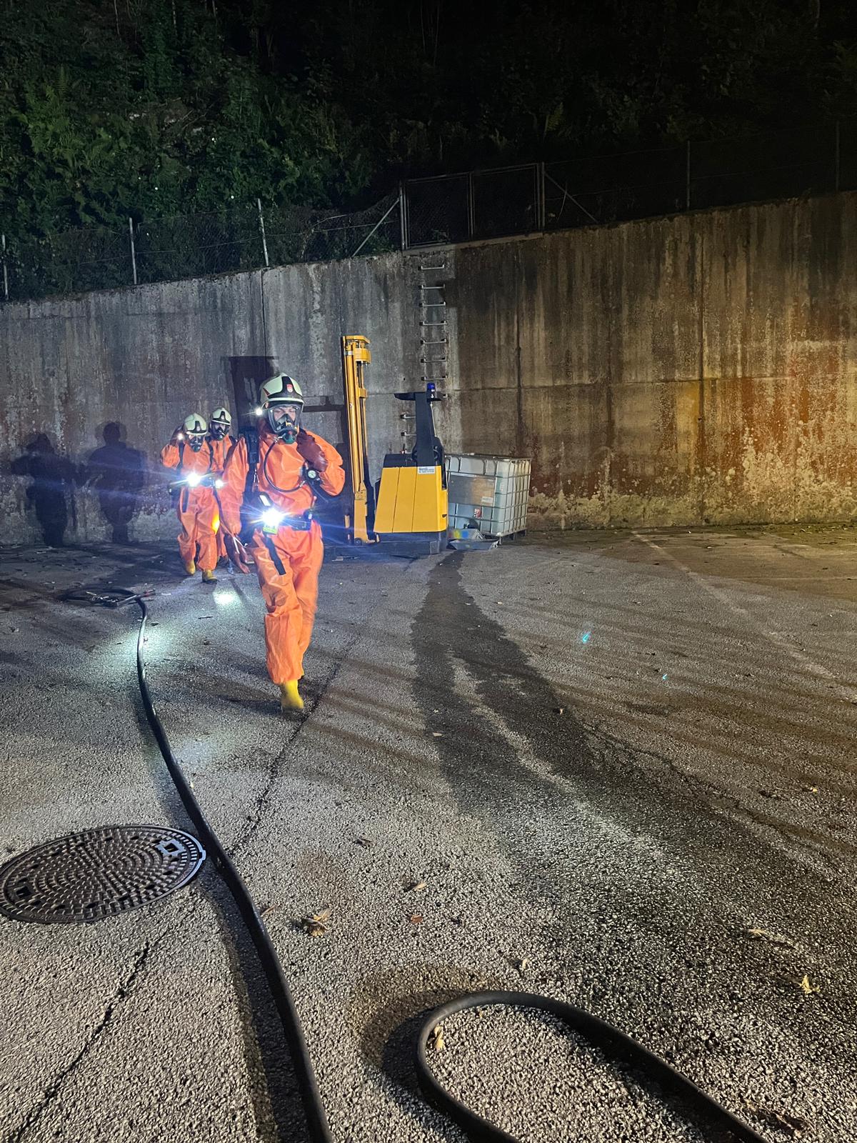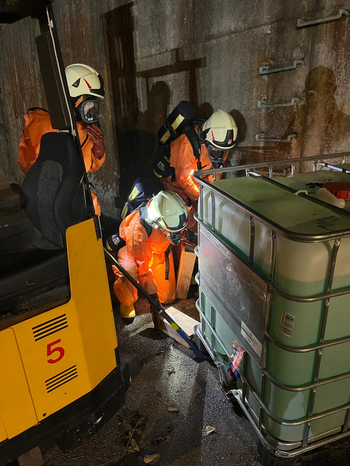 Einsatzstelle absperren, 3 fachen Brandschutz aufbauen, Atemschutztrupp mit Schutzstufe 2 ausrüsten, Menschenrettung, Stapler sichern, Leckschließung biem Behälter, auslaufendes Gefahrgut binden und eventuelle Gullys mit Schachabdeckungen verschließen.
