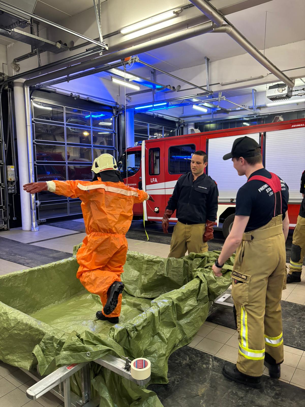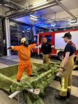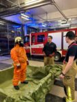 An diesem Schulungsabend ging es neben dem Aufbau der Notdeko, wieder um das richtige An- und Ausziehen der Schutzanzüge und um die richtige Dekontamination ( Reinigung ) von Schadstoffen auf den Schutzanzügen.