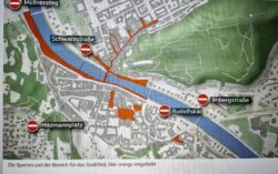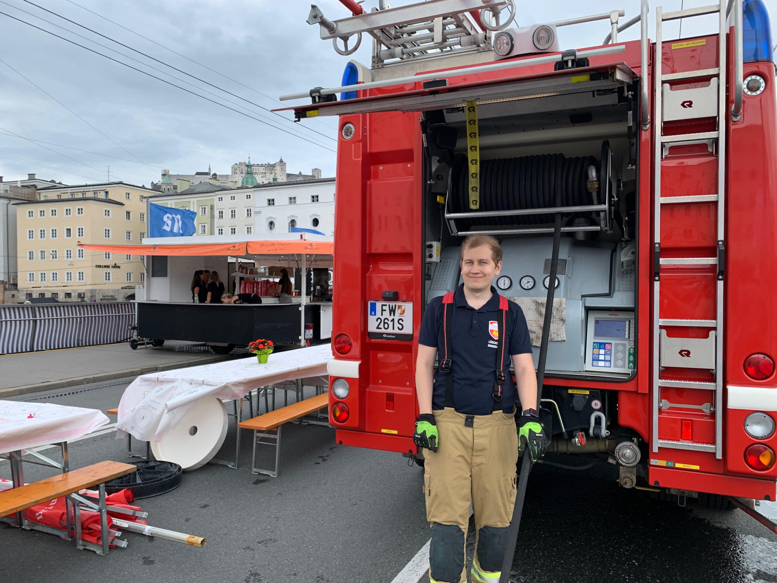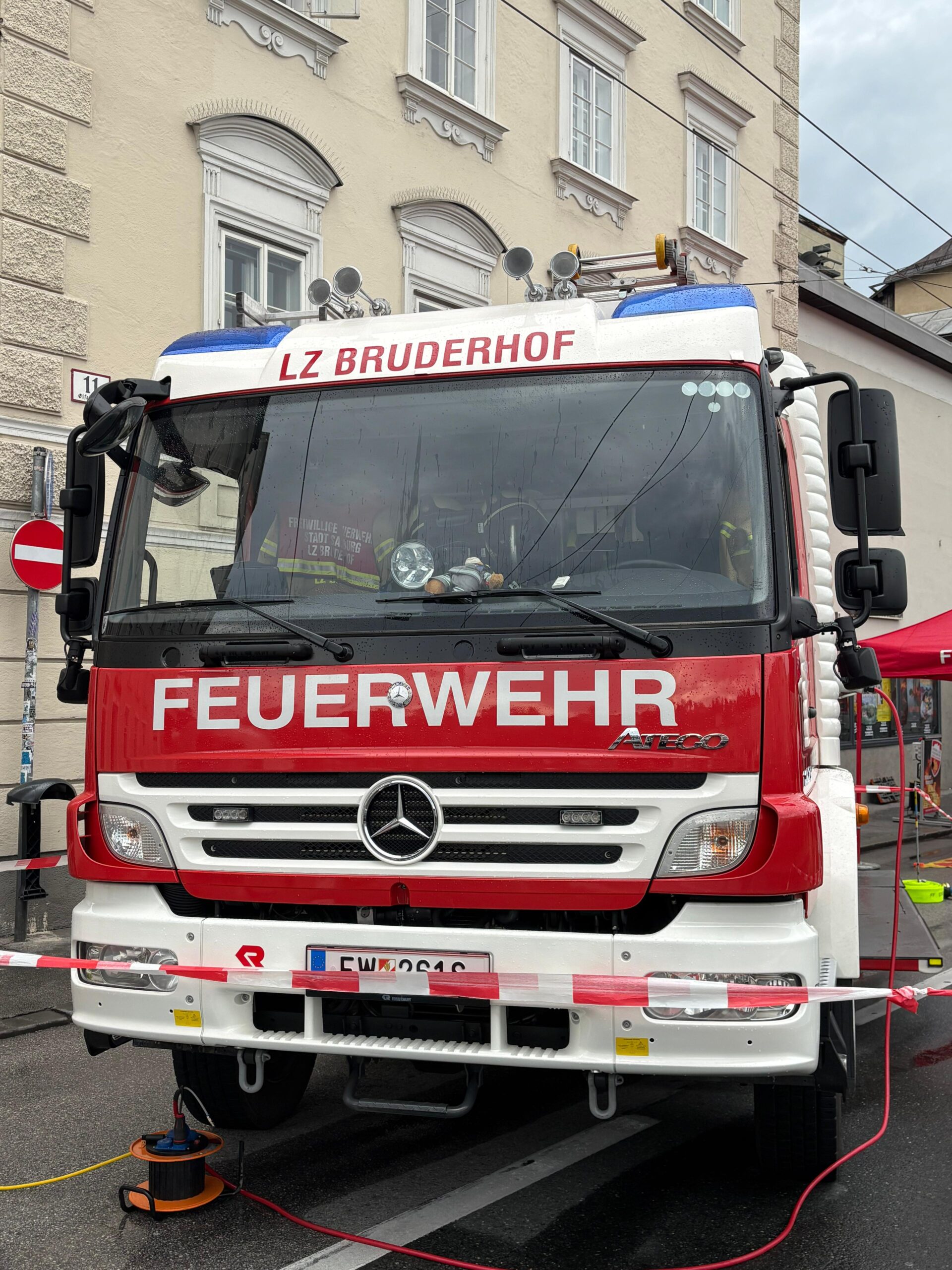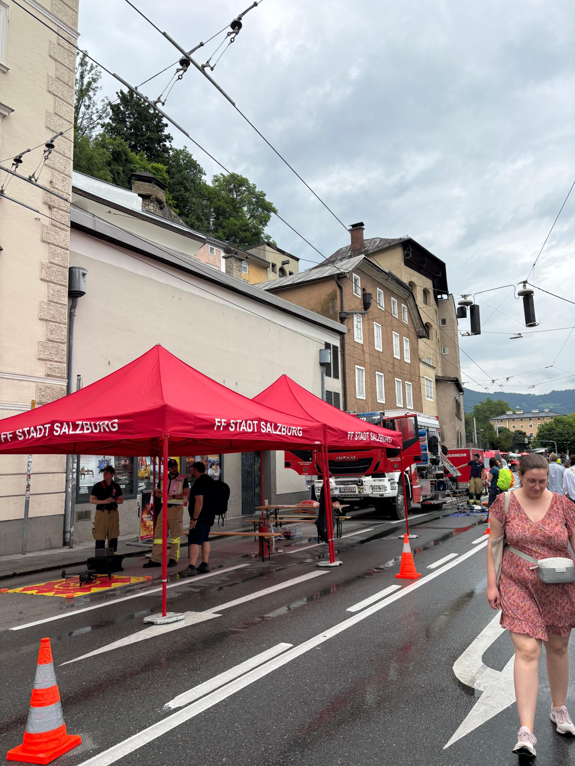 Der Standort des Tanklöschfahrzeuges ist auf Höhe von ” Das Kino ” wo sich auch der Info Stand der Freiwilligen Feuerwehr der Stadt Salzburg befindet.