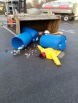 Bei einem Zusammenprall zwischen einem Anhänger und einem Stapler ist der beladene Hänger umgestürzt. Dabei traten Flüssigkeiten aus den transportierten Fässern aus, die mit einer Plane aufgefangen werden mussten. Da es sich im Nahbereich einer Tankstelle befand wurde ein Brandschutz aufgebaut.