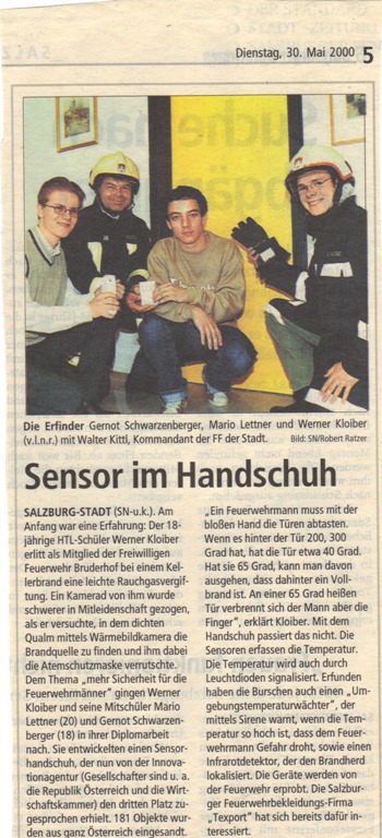 Sein Engagement wurde schon bald erstemals medial gewürdigt und auch sein Trieb zum Tüfteln für die Feuerwehr gipfelte in der Entwicklung eins Hitzesensors für Feuerwehrhandschuhe in der HTL Itzling mit Klassenkameraden !